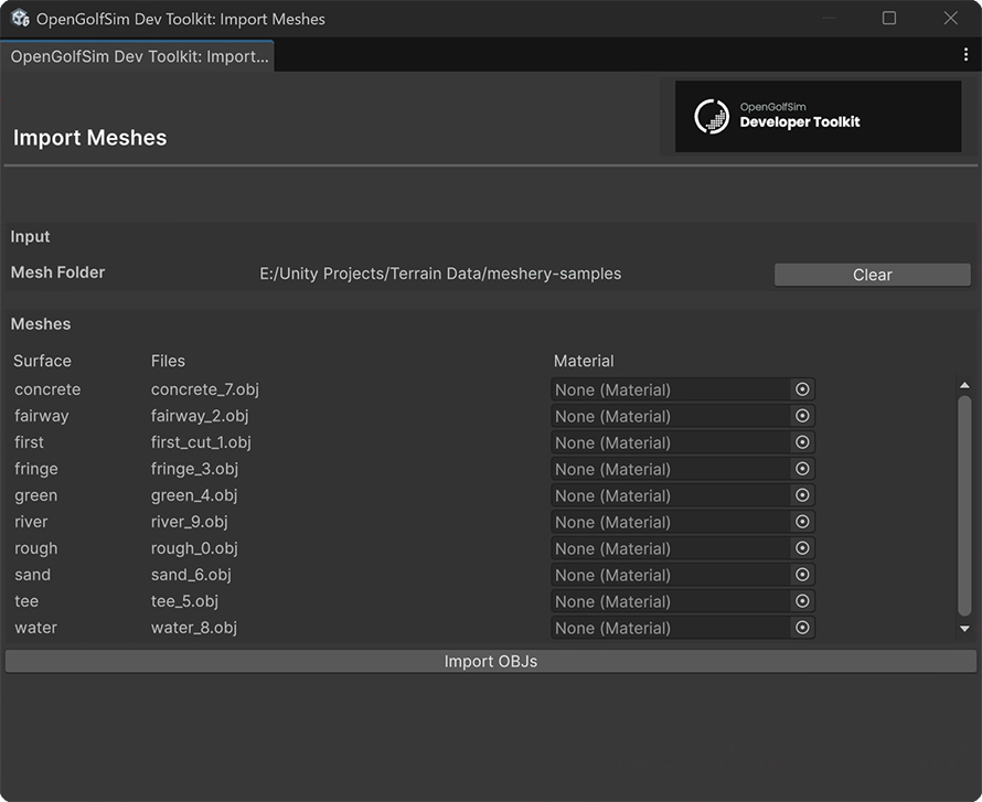Next you’ll want to import the folder of meshes into your Unity project. These meshes will sit just above your terrain layer. Make sure you’re using the project template and have the OpenGolfSim Developer Toolkit package, which should include a tool for importing and batch assigning base materials to your meshes.
